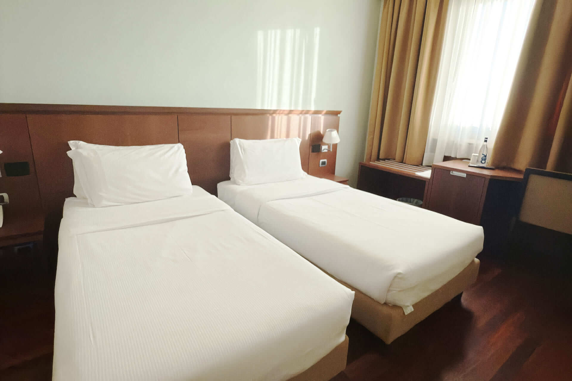 A spacious room with two double beds and parquet flooring. Equipped with air conditioning, dual TVs, free Wi-Fi, and a desk. You’ll also find a minibar, kettle, and safe. The bathroom features a large shower, hairdryer, and complimentary toiletries. Room service is available 24/7.